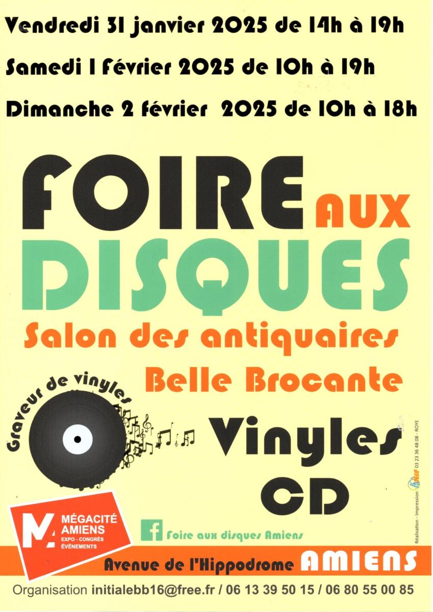 Lieu et informations: Mégacité, Avenue de l'Hippodrome, 80000 Amiens. Exposants: Professionnels, Associations, Collectionneurs. Présence d'un graveur de vinyles. Le stand Actua Music: Produits de protection, d'entretien et Accessoires. Horaires: le 06-14hà19h. Le 07-10hà19h. Le 08-10hà18h. Restauration sur place. Entrée payante